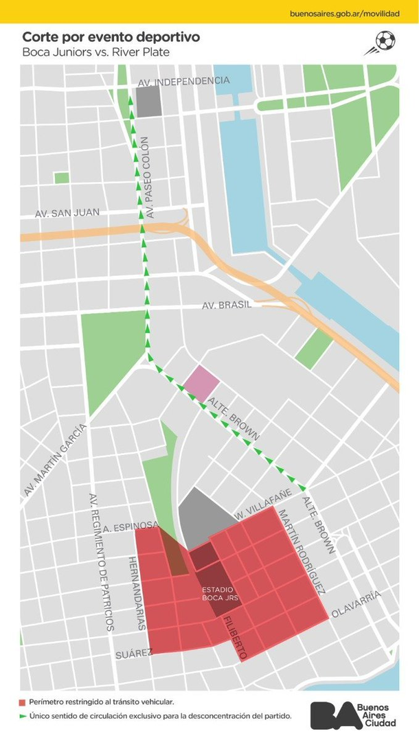 Al finalizar el encuentro, las avenidas Almirante Brown y Paseo Colón se convertirán en mano única sentido al Norte entre Wenceslao Villafañe e Independencia de 18:30 a 20 h a fin de canalizar el flujo vehicular y colaborar con la desconcentración.