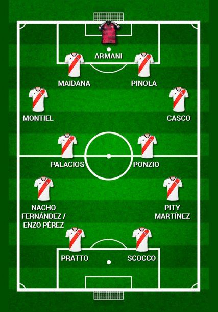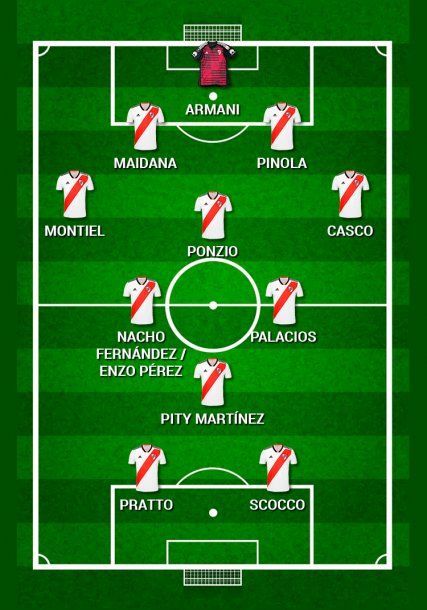 Otro escenario en el que el que ingresa es Scocco por el colombiano. La misma duda: Nacho Fernández o Enzo Pérez. Pity Martínez no estaría en una banda, sino libre, como mediapunta, detrás de Scocco y Pratto.