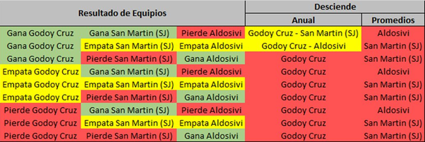 Godoy Cruz: el más comprometido. Necesita ganar y que haya un perdedor entre San Martín y Aldosivi para forzar un desempate. Si empata o pierde, desciende automáticamente.