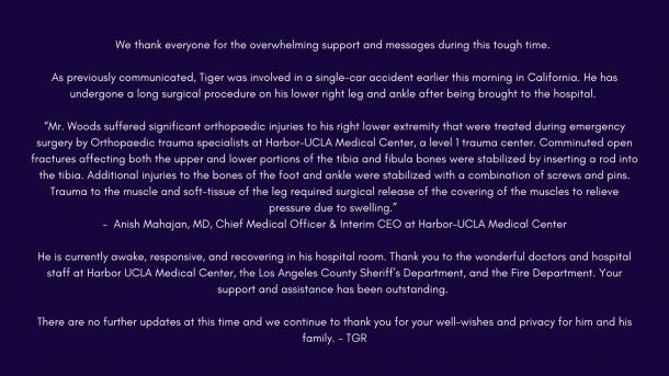 "Agradecemos a todos por el apoyo y los mensajes enviados durante este momento difícil", señalaron a través de la cuenta oficial de Twitter de Woods, que precisa también que el golfista se sometió a "un largo procedimiento quirúrgico en la parte inferior de la pierna derecha y el tobillo después de ser llevado al hospital".