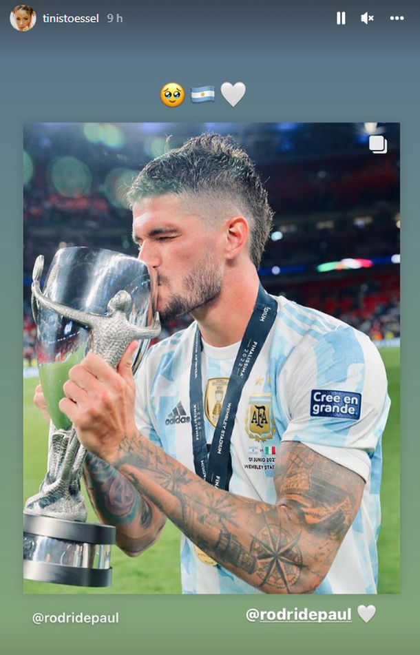 Uno de los más emocionados fue el mediocampista Rodrigo De Paul quien, una vez que el partido finalizó, contó sus sus sensaciones en una entrevista televisiva. Llamó la atención de sus interlocutores el momento en que decidió saludar a sus seres queridos, entre ellos a su reciente amor la cantante Tini Stoessel. “Dejame mandar un beso muy grande a mi familia, a mi mamá, a mis hijos, a toda la gente que está del otro siempre apoyándome, como mi abuela, mi novia, les mando un beso grande, gracias por estar”.
