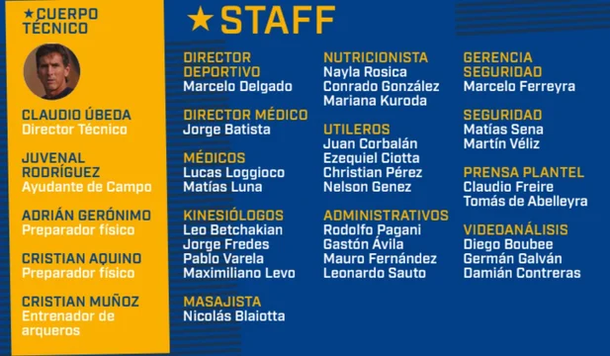 Dentro del nuevo esquema, el cuerpo técnico del plantel profesional está encabezado por Claudio Úbeda, acompañado por Juvenal Rodríguez como ayudante de campo. La preparación física quedó a cargo de Adrián Gerónimo y Cristian Aquino, mientras que Cristian Muñoz es el responsable del entrenamiento de los arqueros.