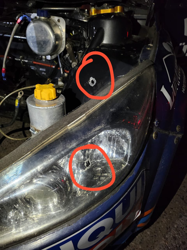 Tal como se constató tras la revisión, el Ford Focus de Pernía, atendido por el MG-C Pergamino, tenía dos impactos de bala en la parte frontal. Uno en la óptica y el otro en la parrilla que cubre el radiador. Y ambos disparos fueron del lado izquierdo del auto, donde se ubica el conductor.