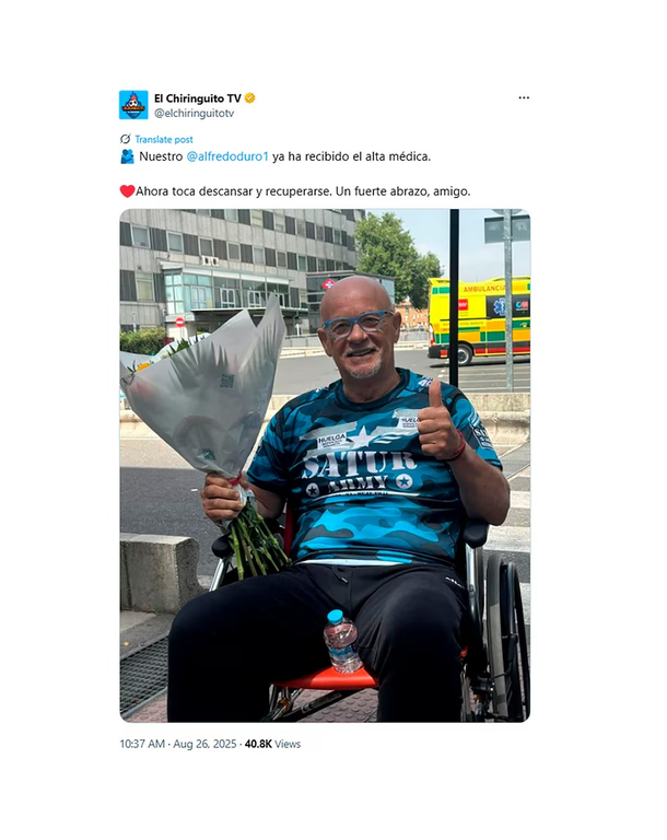 Este martes, el programa confirmó en su cuenta oficial de X que el periodista había recibido el alta hospitalaria y se encontraba en proceso de recuperación. En la publicación, se lo vio sonriente, en silla de ruedas y levantando el pulgar, acompañado por un ramo de flores enviado por sus compañeros.