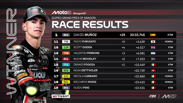 En su camino de aprendizaje en la categoría más baja del motociclismo, el Coyote sigue sumando puntos para el equipo Red Bull KTM Tech3 y ahora tiene 27 que consiguió en Qatar (1), España (6), Francia (6), Gran Bretaña (11) y Aragón (3). Vale recordar que el piloto nació en España pero que eligió representar a nuestro país.