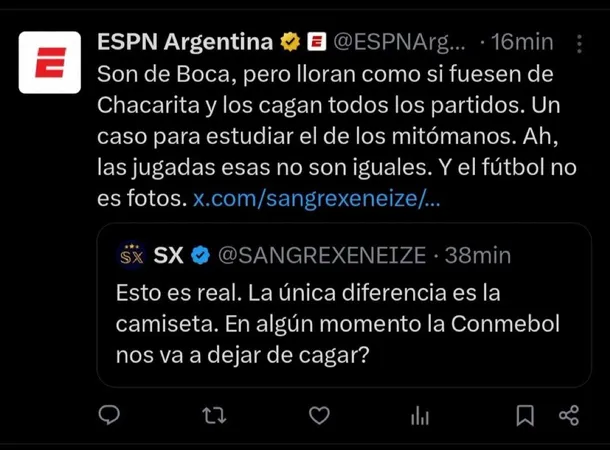 "Son de Boca, pero lloran como si fuesen de Chacarita y los cagan todos los partidos. Un caso para estudiar el de los mitómanos. Ah, las jugadas esas no son iguales. Y el fútbol no es fotos", expresó el CM de ESPN, en un clarísimo error. El administrador de las redes sociales del canal se confundió de cuentas y luego debió borrarlo.