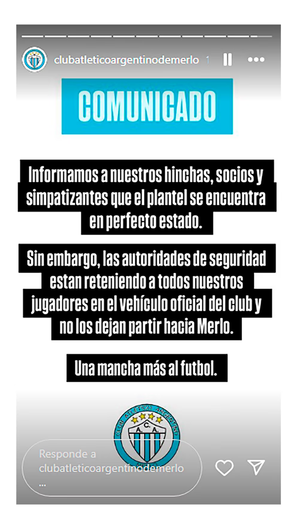 Además de las agresiones físicas, el conflicto se trasladó a las redes sociales. Argentino de Merlo publicó un comunicado en el que expresó su indignación por la retención de su delegación en el estadio. “Las autoridades de seguridad están reteniendo a todos nuestros jugadores en el vehículo oficial del club y no los dejan partir hacia Merlo. Una mancha más al fútbol”, señalaba el texto.