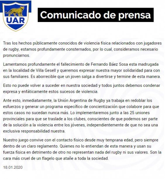 La Unión Argentina de Rugby sacó un comunicado en las últimas horas tras darse a conocer el caso del joven que murió tras una golpiza en Villa Gesell.