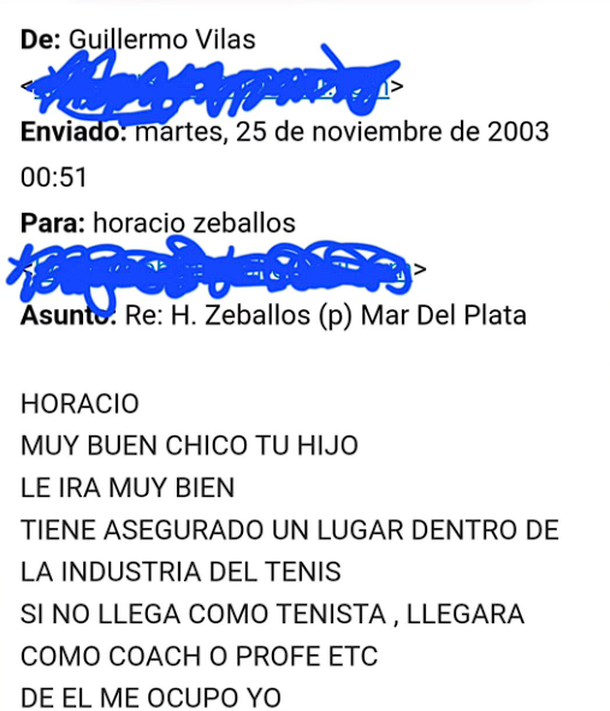 El correo electrónico data del 25 de noviembre de 2003, pasado 51 minutos de aquel martes, en el que la leyenda del tenis argentino le escribió al padre de Zeballos con el cual tenían una relación de amistad ya que ambos eran de Mar del Plata y se cruzaban en los clubes Náutico, donde entrenaba Vilas, y el Edison Lawn Tenis Club, donde Zeballos era el encargado.