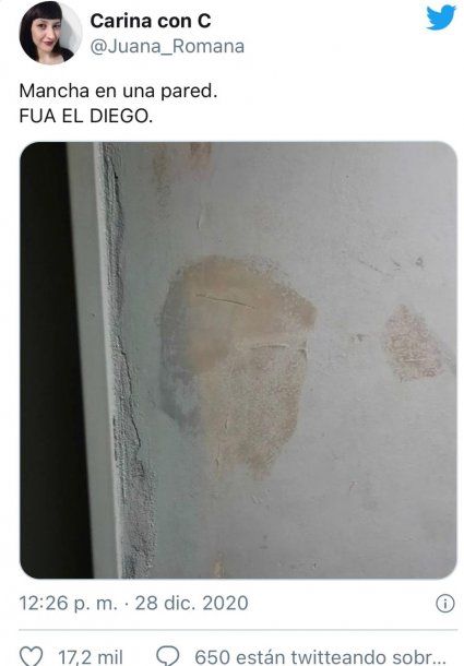 "MANCHA EN LA PARED, FUE EL DIEGO", comentó junto a la foto. La imagen se volvió viral, con 17 mil likes y 579 retuits. Algunas personas que lo vieron coincidieron en el parecido, pero otras se burlaron con divertidos gif y memes.