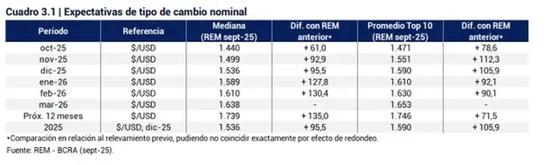 Para octubre de 2025, el promedio de las proyecciones ubica el tipo de cambio oficial en $1.440, apenas por encima del valor actual, que ronda los $1.430. Según los analistas del llamado “Top 10”, el tipo de cambio nominal promedio esperado podría ser un poco mayor y alcanzar los $1.471.