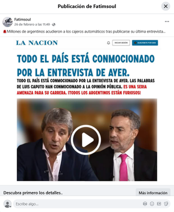Con el objetivo de engañar a los usuarios y obtener información personal, los estafadores utilizan un perfil de Facebook donde publican un video con una falsa declaración del ministro Caputo creada presuntamente con mecanismos de inteligencia artificial.