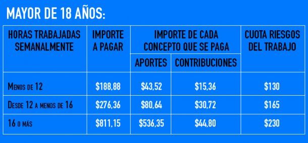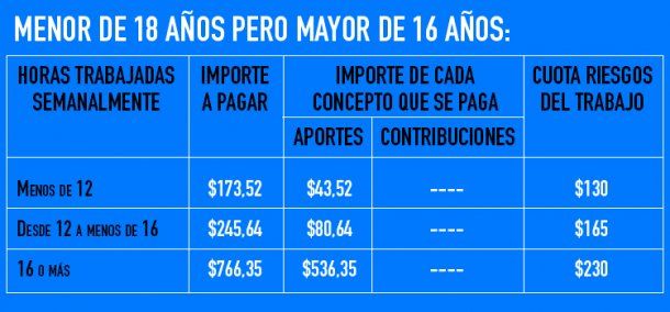 Para menores de 18 años pero mayores de 16, por menos de 12 horas semanales el aporte mensual será desde ahora de $173,52.