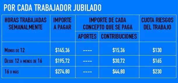 También, por cada jubilado los nuevos aportes ascienden a $145,36 por menos de 12 horas de trabajo semanal; de 12 a menos de 16 horas por semana, $195,72 y por 16 horas o más, a $274,80.