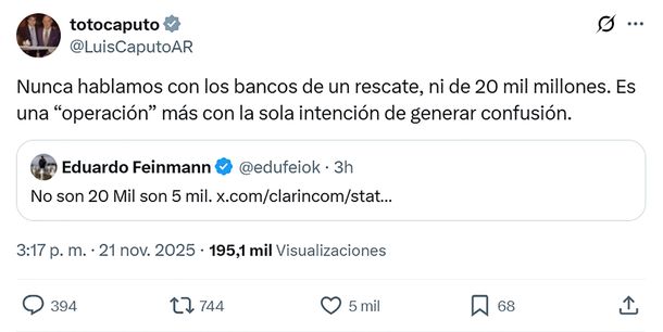 “Nunca hablamos con los bancos de un rescate, ni de 20 mil millones. Es una ‘operación’ más con la sola intención de generar confusión”, indicó el ministro de Economía mediante un posteo en X, red social que se hizo eco del revés sufrido por el plan económico de Javier Milei, sostenido exclusivamente a base de tomar deuda en el exterior.
