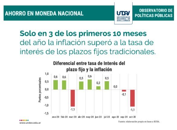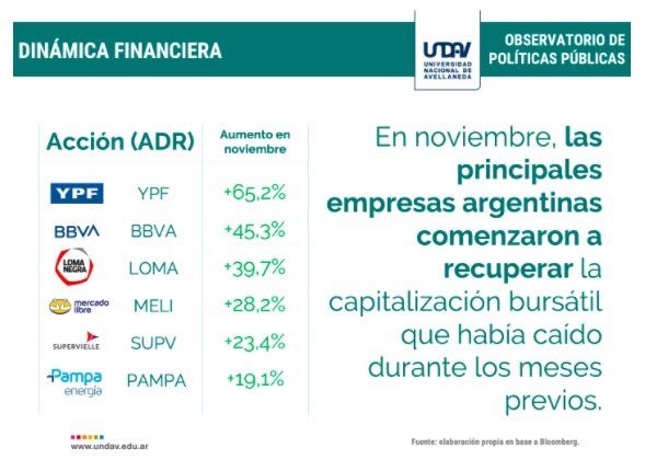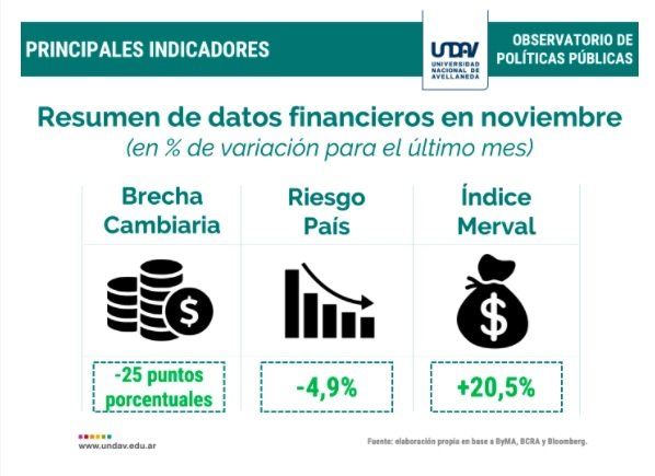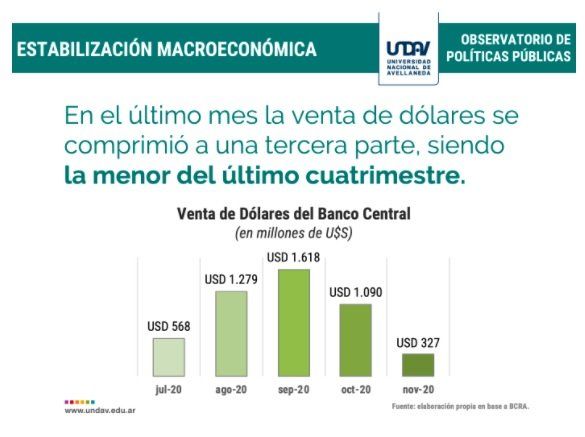 "Otra cuestión a destacar es que la base monetaria, luego del gran incremento registrado en los primeros meses críticos de la pandemia, se estabilizó en un nivel constante ($2,3 billones) a partir de julio, quitando presión sobre las cotizaciones bursátiles e ilegales, de modo de tranquilizar la macroeconomía, condición necesaria para un crecimiento sostenible que permite disminuir y erradicar el hambre y la pobreza", concluyó la Undav.