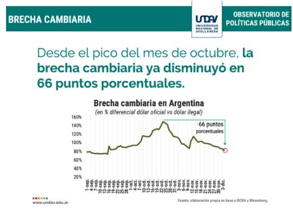 Así quedó evidenciado en el último informe del Observatorio de Políticas Públicas de la Universidad Nacional de Avellaneda (Undav) que recuerda que luego de la última semana de octubre, cuando las brechas cambiarias tocaron sus puntos máximos con respecto al tipo de cambio oficial mayorista (el dólar blue con una brecha de casi el 150%, el Contado con Liquidación con una del 132% y del dólar MEP con una de 109,3%) hoy esas diferencias, merced de las medidas implementadas por el ministro de Economía Martín Guzmán por un lado y por el presidente del Banco Central, Miguel Ángel Pesce, por el otro, se redujeron hasta niveles que oscilan entre el 75% y el 84%.