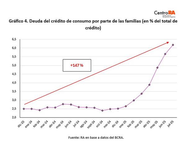 El informe también pone el foco en un fenómeno preocupante: el aumento de la morosidad en el crédito al consumo. Desde diciembre de 2023, el indicador subió un 147%, pasando del 2,5% al 6,2% del total. En otras palabras, no solo más familias se endeudan para comprar alimentos, artículos de higiene o productos de primera necesidad, sino que también crece la dificultad para cumplir con los pagos mensuales.