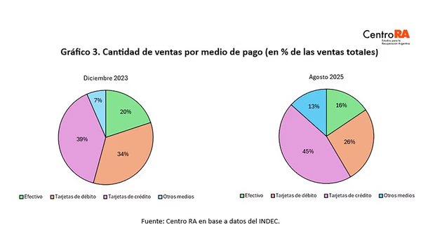 El trabajo detalla que este aumento en el uso del crédito se dio a la par de una caída en otros medios de pago. Las operaciones con tarjeta de débito descendieron del 34% al 26%, mientras que el uso de efectivo se redujo del 20% al 16%. En contraposición, las billeteras virtuales crecieron del 7% al 13%, reflejando la búsqueda de alternativas digitales en medio de la crisis.