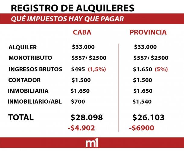 Tras las deducciones, ese alquiler de 33.000 queda en 4.900 pesos contemplando un monotributo de $557 (propietario con un trabajo en relación de dependencia). Ahora si la renta está en la provincia de Buenos Aires, del alquiler de $33.000 le queda al dueño del inmueble 26.000, unos 7.000 menos, el 20% del alquiler.