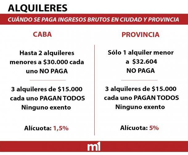 En Provincia, la base no imponible es $32.600. Y, a diferencia de CABA, el propietario que tiene hasta un solo alquiler menor a $32.600 no paga Ingresos Brutos. Ahora, si tiene 2 contratos o más que sean menores a ese monto, tiene que abonar la alícuota por cada alquiler. La excepción es para los propietarios que tienen sólo una vivienda o local en alquiler, explicaron voceros de ARBA a minutouno.com.