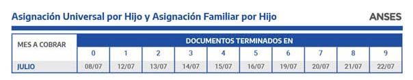 La ANSES informó el calendario de pagos del mes de julio para jubilados, pensionados y Pensiones No Contributivas, titulares de la Asignación Universal por Hijo y la Asignación por Embarazo, Asignaciones Familiares y de Pago Único (Matrimonio, Nacimiento y Adopción) y Prestación por Desempleo.