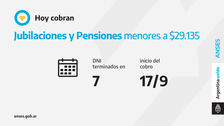 Las sucursales bancarias habilitadas atenderán por ventanilla a jubilados, jubiladas, pensionados y pensionadas con documentos terminados en 7 cuyos haberes NO SUPEREN la suma de 29.135 pesos.