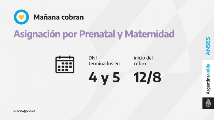 Las titulares de la Asignación por Prenatal y Asignación por Maternidad con documentos terminados en 4 y 5 perciben este jueves su prestación.