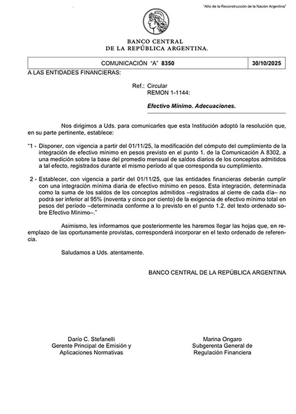 Mediante la Comunicación A 8350, publicada este jueves, la entidad que preside Santiago Bausili comunicó en el cálculo de la medición del “efectivo mínimo”, que pasa a ser “sobre la base del promedio mensual de saldos diarios de los conceptos admitidos a tal efecto, registrados durante el mismo período al que corresponda su cumplimiento”.
