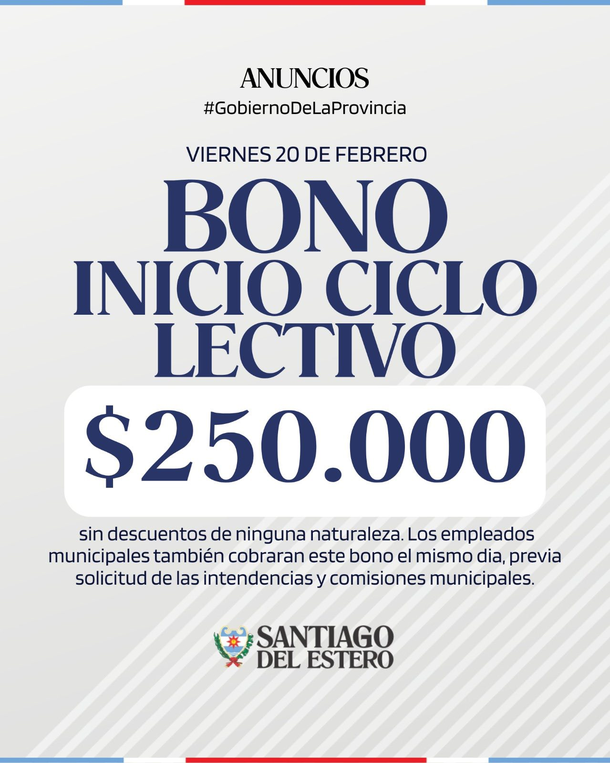El primer bono, que se pagará de forma previa al inicio del ciclo lectivo, será depositado el próximo viernes 20 de febrero y consistirá en una suma de $250.000, sin descuentos de ninguna naturaleza. Los empleados municipales también percibirán este beneficio el mismo día, previa solicitud de sus respectivas intendencias y comisiones.