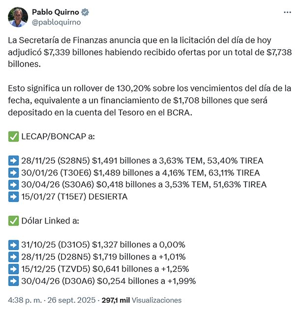 Así lo informó el secretario Pablo Quino mediante redes sociales, confirmando que “significa un rollover de 130,20% sobre los vencimientos del día de la fecha, equivalente a un financiamiento de $1,708 billones que será depositado en la cuenta del Tesoro en el BCRA”.