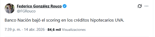 El economista Federico González Rouco, de la consultora Empiria, confirmó públicamente a través de sus redes sociales que "efectivamente Banco Nación bajó el scoring para hipotecarios UVA. Confirmado. Clave para el mercado de crédito".
