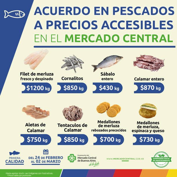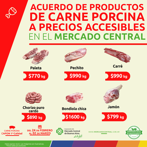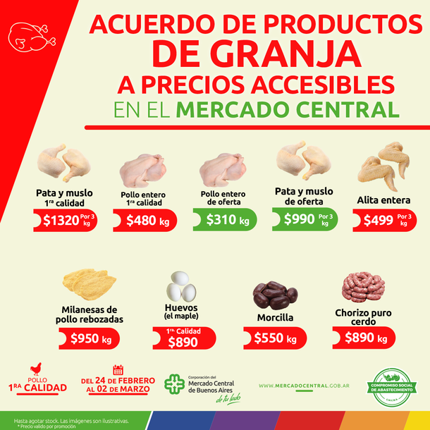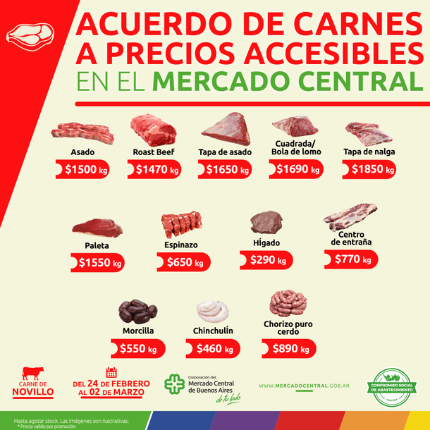 El Mercado Central de Buenos Aires renovó el acuerdo de precios vigente en su feria minorista y ofrece una serie de productos a precios promocionales que estarán vigentes hasta el próximo jueves. El nuevo acuerdo ofrece una amplia variedad de carnes a precios accesibles.