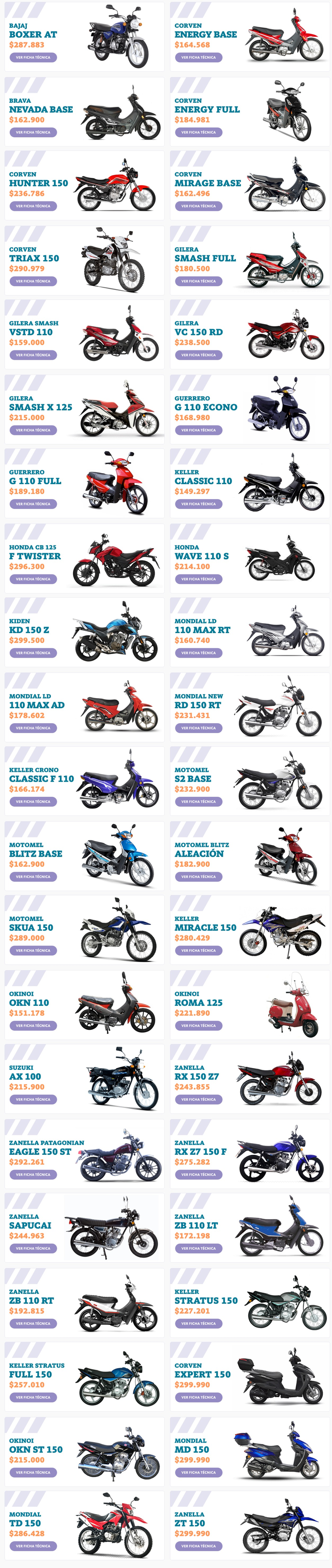 Las motos deben ser adquiridas a través de Tienda BNA. Se financiará el 100% del valor de venta del vehículo (IVA incluido). No se financiará el patentamiento ni otros gastos administrativos de entrega, los cuáles serán informados por los concesionarios al momento de la facturación y deberán ser abonados por los solicitantes. Sus precios van desde alrededor de 160 mil hasta el tope de 300 mil.