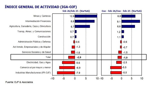 El Índice General de Actividad (IGA), elaborado por la consultora de Orlando Ferreres, confirmó la tendencia negativa. Según ese relevamiento, la contracción está explicada principalmente por el mal desempeño de la industria y el comercio, a lo que se suma una caída más leve en la generación eléctrica. En contrapartida, sectores como el agro, la minería y la intermediación financiera mostraron mejoras, aunque insuficientes para compensar el retroceso general.
