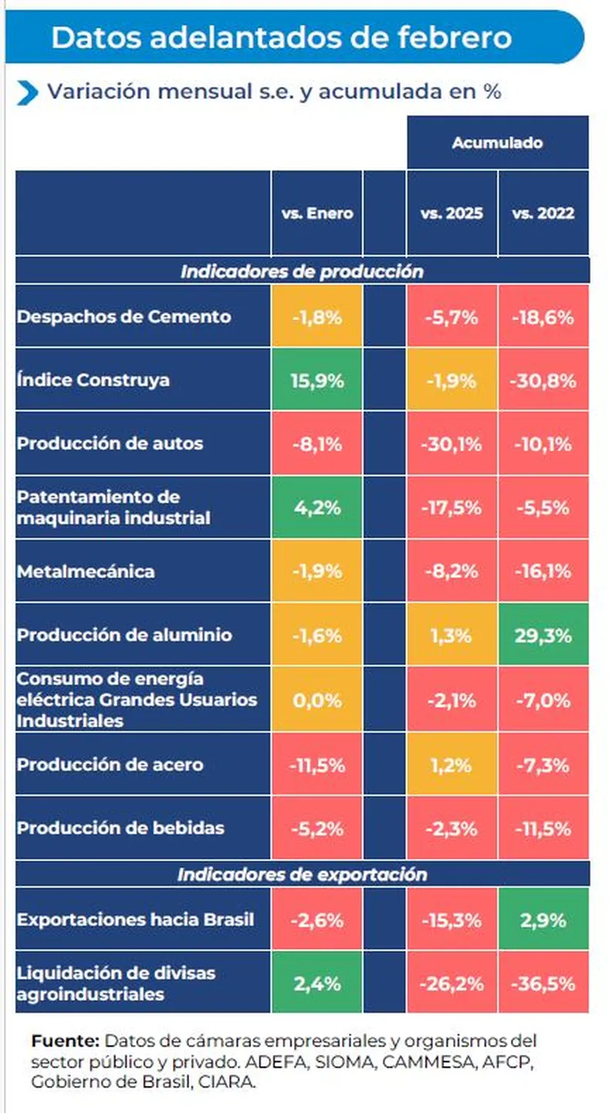 En la misma línea, el informe del Unión Industrial Argentina (UIA) ratificó que la industria atraviesa uno de sus momentos más complejos. La entidad estimó una caída interanual cercana al 3% en febrero, con bajas significativas en ramas clave como la producción de acero (-11%), la industria automotriz (-8,1%) y el sector de bebidas (-5,2%). También se registraron descensos en la actividad metalmecánica y en la fabricación de aluminio.