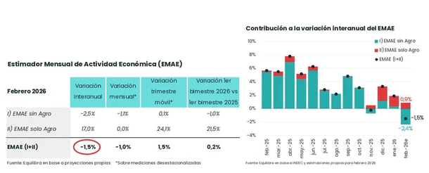 Por su parte, el Estimador Mensual de Actividad Económica (EMAE) de la consultora Equilibra también marcó un retroceso: -1% en la comparación mensual y -1,5% interanual. Según el informe, la caída se explica en parte por factores estacionales, como la menor cantidad de días hábiles debido a los feriados de carnaval, aunque no alcanza para justificar por completo la desaceleración.
