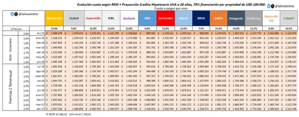 Salinas indicó que el Nación operó primero con una tasa del 4,5% y luego con una del 6%, siempre en créditos indexados por UVA. En enero de 2026, la cuota inicial para el ejemplo considerado se ubica en torno a los $820.000 mensuales.