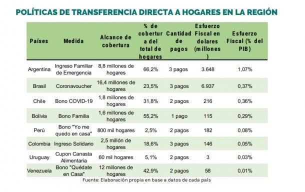 Todos los países de la región tuvieron un programa similar al IFE "sin embargo se observó que la política implementada en Argentina resultó ser la de mayor índice de cobertura, alcanzando a un 66,2% de los hogares, e implicando el mayor esfuerzo fiscal, en relación con el PBI (1,07%)" indica el informe de la Undav entres sus consideraciones finales.