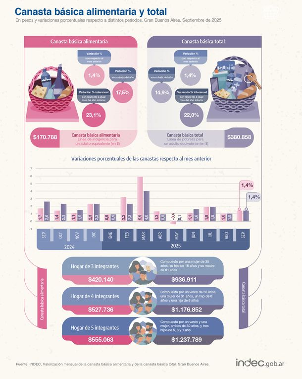 En este sentido, el organismo señaló que, en lo que respecta a la "Canasta básica total", un hogar de cuatro integrantes requirió $1.176.852,05.- para superar el umbral de pobreza, lo que representa un 1,4% más que el dato lanzado en agosto.