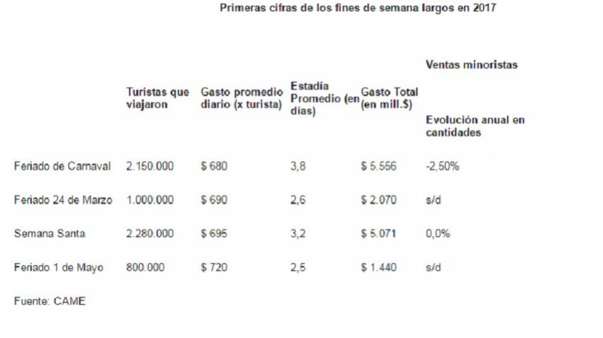 "Si no fuera por los viajes de argentinos hacia destinos como Chile, Paraguay, Miami, Uruguay o Brasil, el fin de semana hubiera sido más animado", evaluó la CAME, aunque aclaró que "estuvo en línea con las expectativas para esta época".