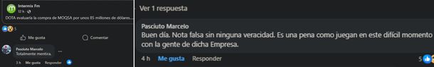 “Nota falsa sin ninguna veracidad”, sumó en otro comentario a través de redes sociales, donde también expuso que “es una pena como juegan en este difícil momento con la gente de dicha empresa”.
