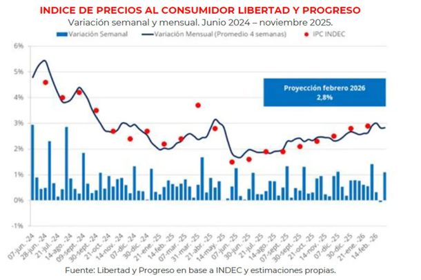 La Fundación Libertad y Progreso prevé para el mes que está por termina un incremento del índice de precios al consumidor (IPC) de 2,8% mensual, después del 2,9% publicado por el intervenido Indec para el mes pasado.