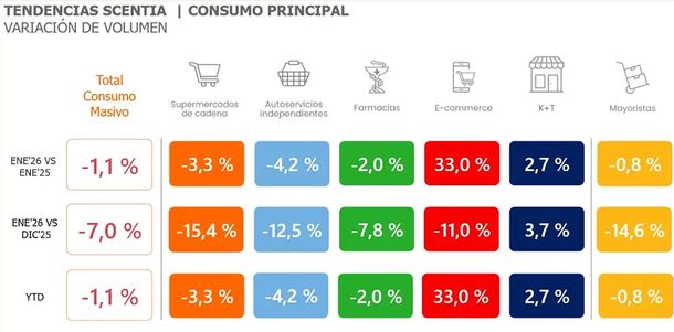 En términos interanuales (enero 2026 contra el mismo mes del año pasado), la caída promedio en la venta de productos de consumo masivo fue de 1,1%, con solo dos canales con resultado positivo: el e-commerce creció 33% y en almacenes y kioscos también aumentó 2,7%.