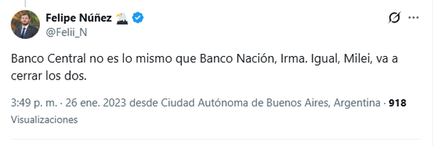 En enero de 2023, reafirmó su postura privatizadora asegurando que Javier Milei iba a "cerrar los dos", en clara referencia tanto al Banco Central como al Nación.
