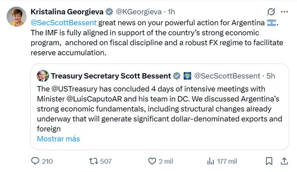 También en X, Kristalina Georgieva respondió una publicación de Scott Bessent al calificar como “excelentes noticias sobre su potente acción para Argentina”, haciendo hincapié en la eventual “acumulación de reservas” que, por el momento, Caputo no pudo lograr, en su afán por sostener la banda cambiaria del dólar estadounidense y evitar una devaluación.