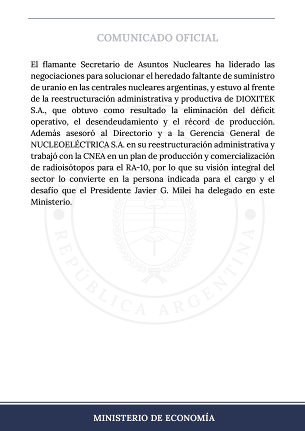 “Su visión integral del sector lo convierte en la persona indicada para el cargo y el desafío que el presidente Javier Milei ha delegado en este Ministerio”, concluye el comunicado.