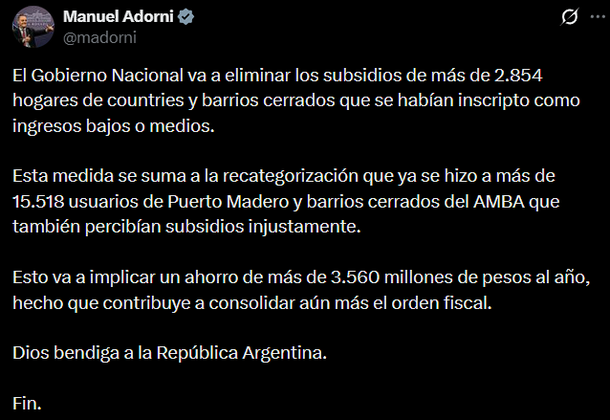 Según informó el jefe de Gabinete de ministros, Manuel Adorni, "esta medida se suma a la recategorización que ya se hizo a más de 15.518 usuarios de Puerto Madero y barrios cerrados del AMBA que también percibían subsidios injustamente".