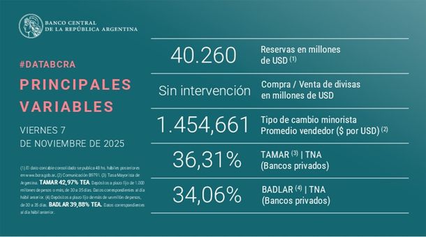 En otro orden, el Banco Central también divulgó este viernes Relevamiento de Expectativas de Mercado (REM) correspondiente a octubre último, con los principales pronósticos macroeconómicos sobre la evolución de las variables económicas y financieras como el dólar y la inflación.