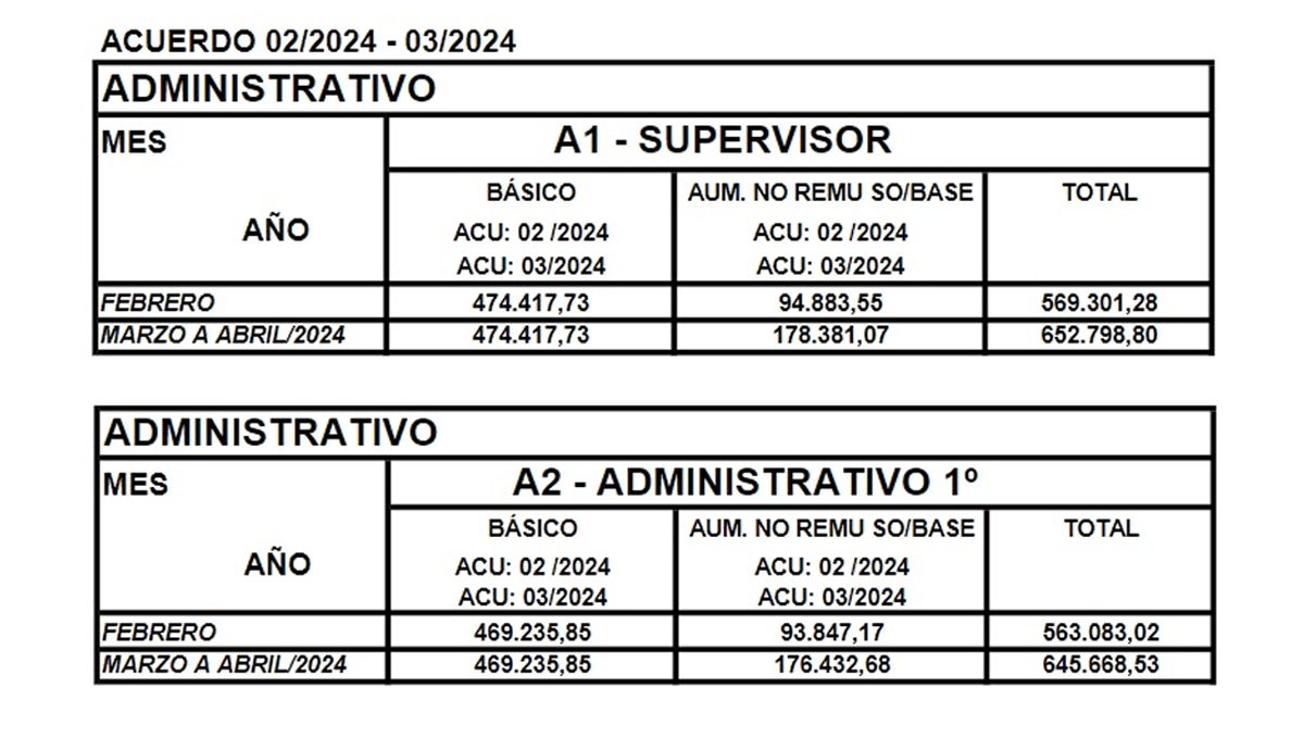 - Administrativo 1°: marzo a abril: salario básico $469.235,85 + incremento no remunerativo $176.432,68 = total $645.668,53.